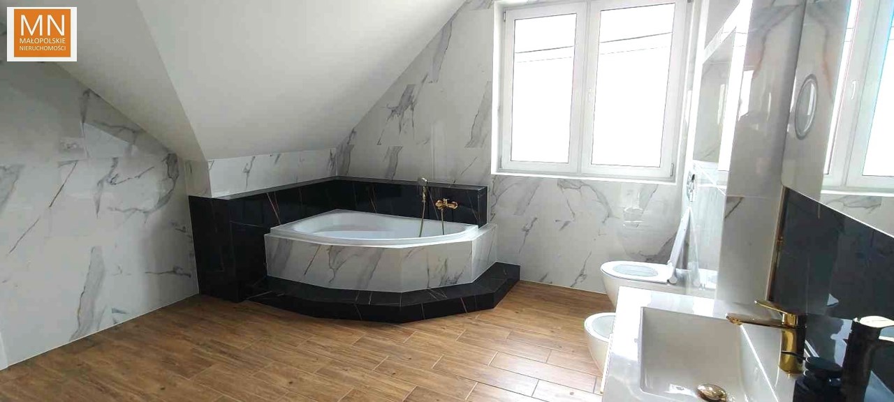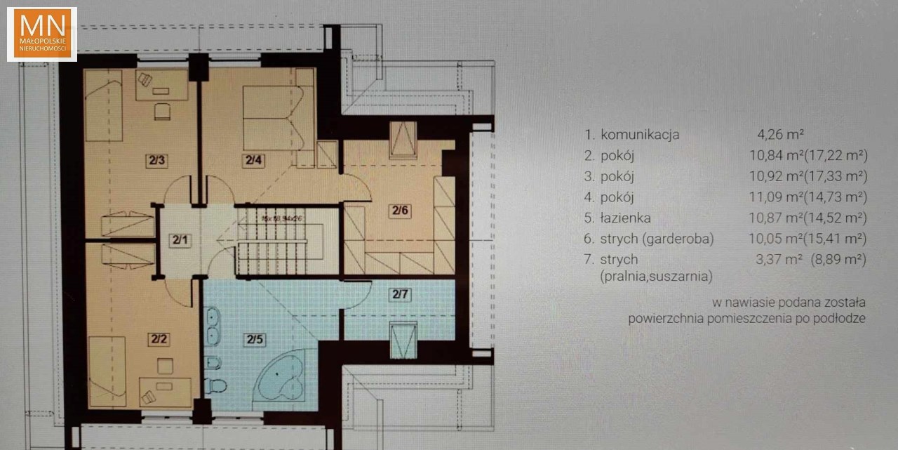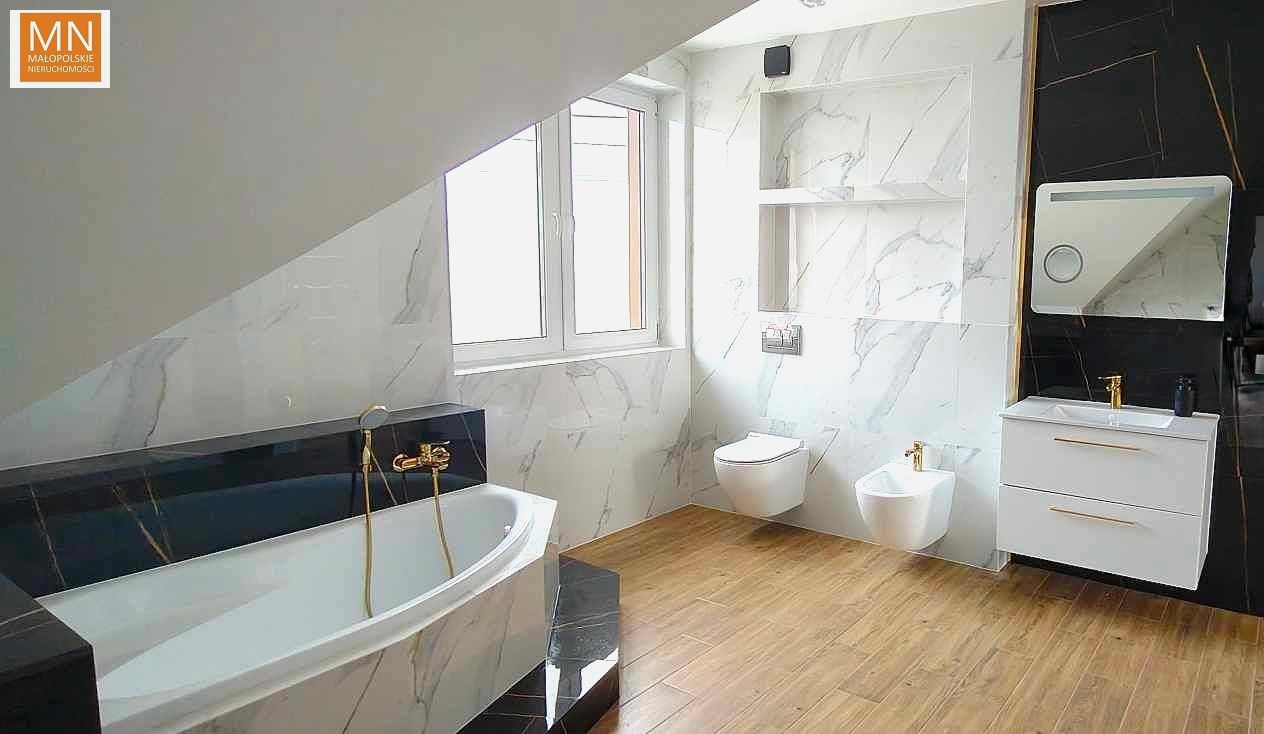 NA PODDASZU są trzy ustawne sypialnie, z czego jedna zawiera przejście do obszernej garderoby. Z korytarza dostępna jest łazienka (14,52m2 po podłodze) wykończona w wysokim standardzie i najnowszych trendach, duża wanna, okno i dodatkowo połączona jest z pralnią/garderobą (około 9 m2 po podłodze z oknem dachowym).