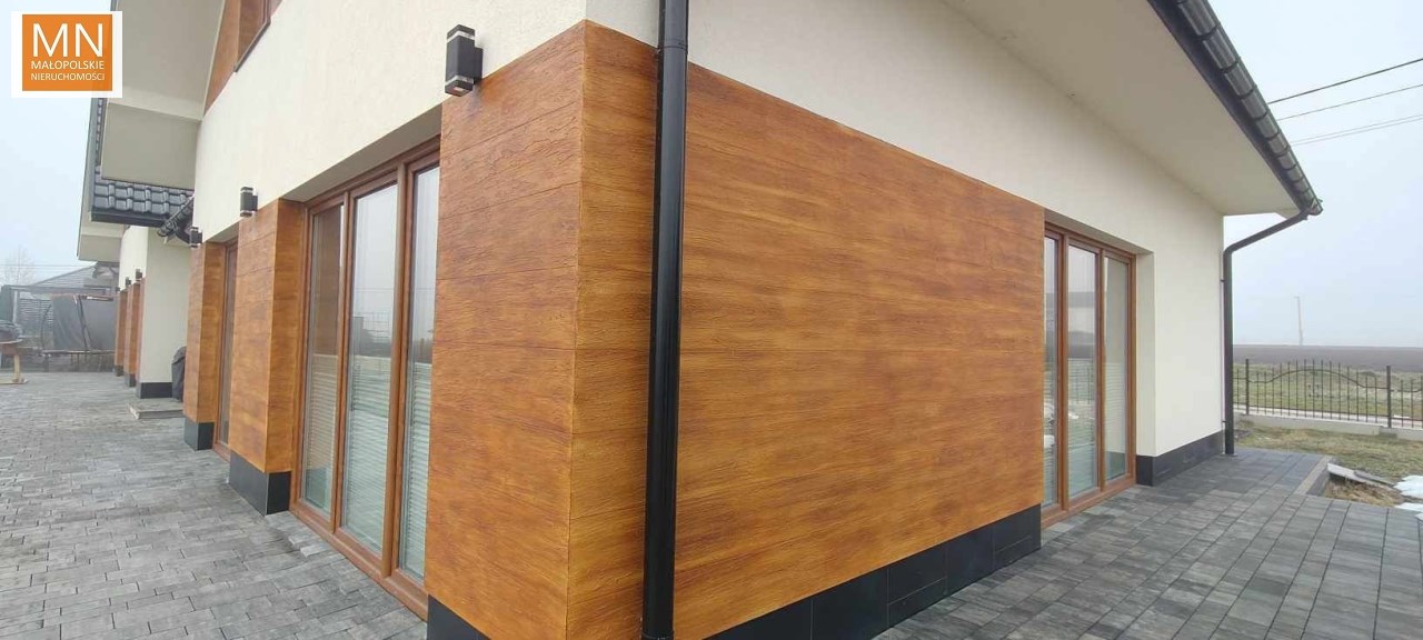 Dom prezentuje się elegancko ze względu na gustowne połączenie materiałów wykończeniowych. Białe ściany tynkowe urozmaicono wstawkami w kolorze ciepłego odcienia drewnianej deski.
